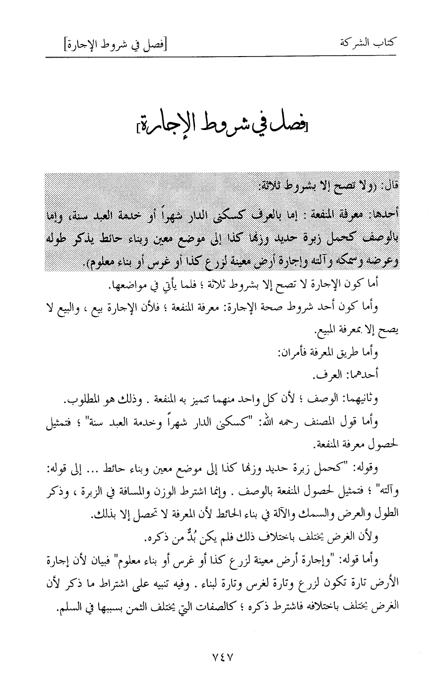 أحدها: معرفة المنفعة: إما بالعرف كسكنى الدار شهراً أو خدمة العبد سنة، وإما بالوصف كحمل زبرة حديد وزنها كذا إلى موضع معين وبناء حائط يذكر طوله وعرضه وسمكه وآلته وإجارة أرض معينة لزرع كذا أو غرس أو بناء معلوم).