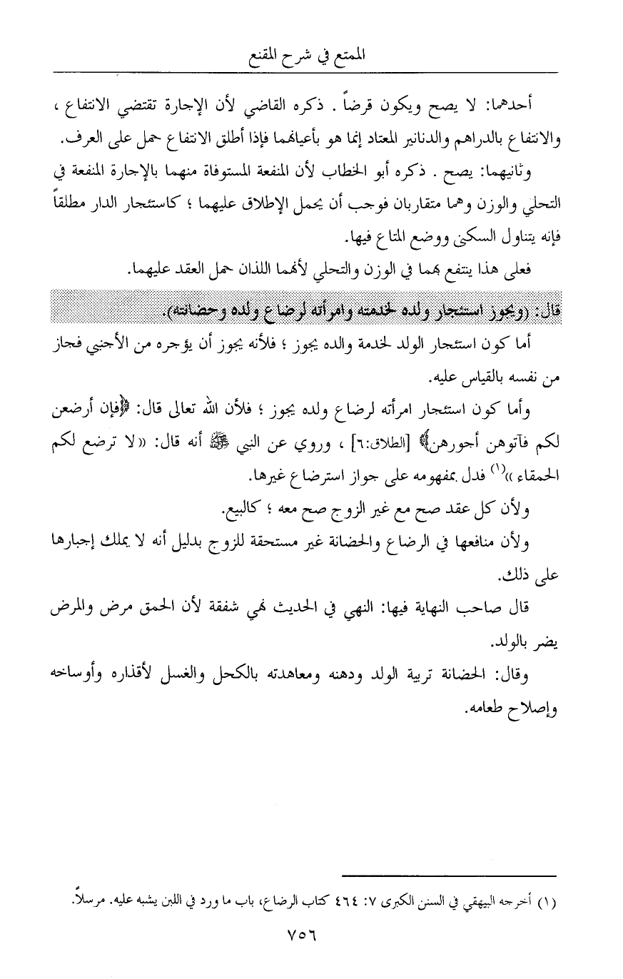 ولأن منافعها في الرضاع والحضانة غير مستحقة للزوج بدليل أنه لا يملك إجبارها على ذلك.