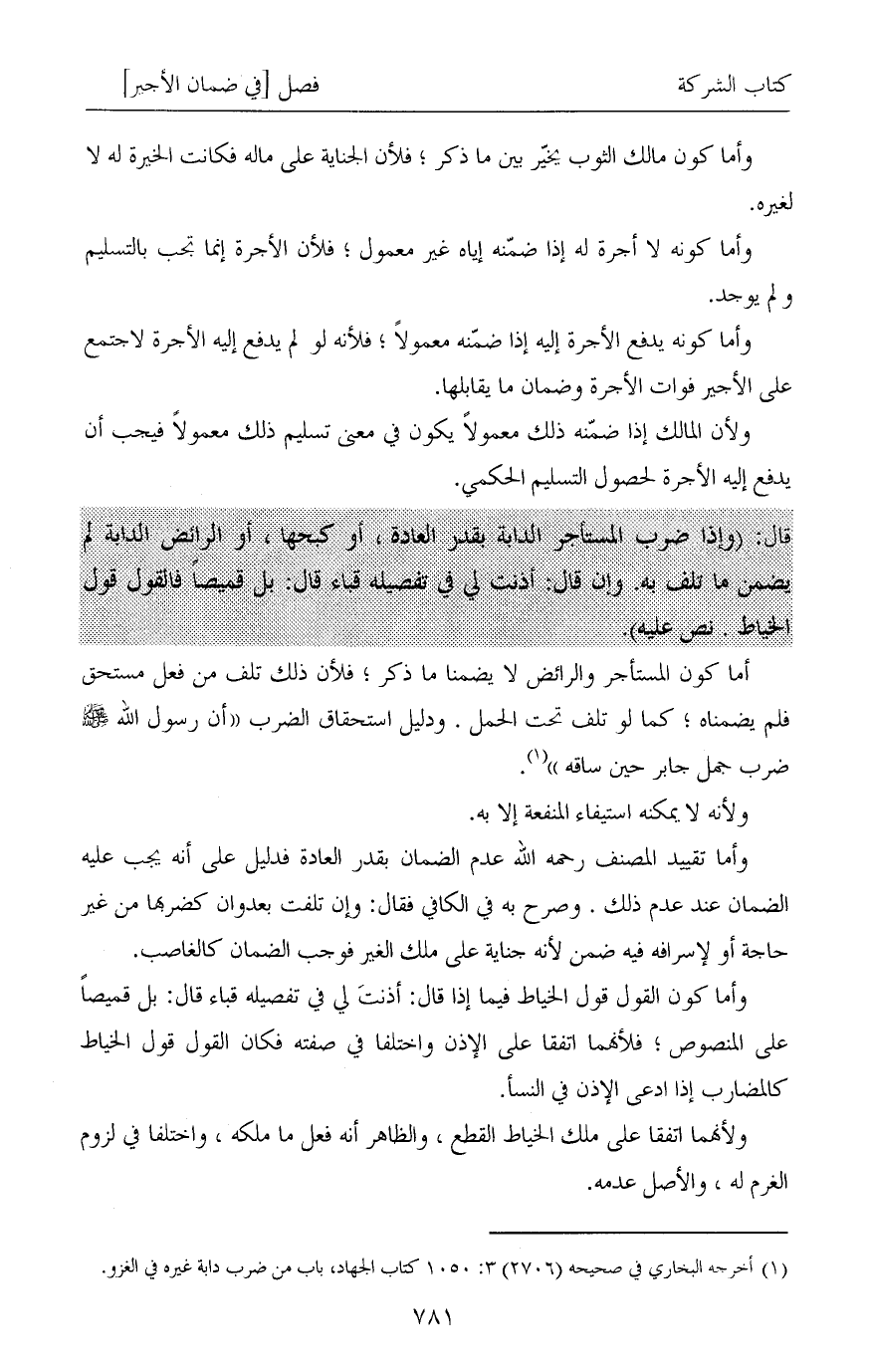 وأما تقييد المصنف رحمه الله عدم الضمان بقدر العادة فدليل على أنه يجب عليه الضمان عند عدم ذلك. وصرح به في الكافي فقال: وإن تلفت بعدوان كضربها من غير حاجة أو لإسرافه فيه ضمن لأنه جناية على ملك الغير فوجب الضمان كالغاصب.