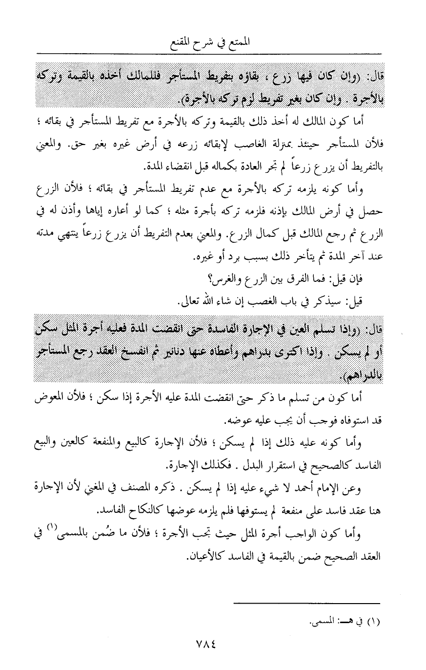 وأما كونه يلزمه تركه بالأجرة مع عدم تفريط المستأجر في بقائه؛ فلأن الزرع حصل في أرض المالك بإذنه فلزمه تركه بأجرة مثله؛ كما لو أعاره إياها وأذن له في الزرع ثم رجع المالك قبل كمال الزرع. والمعني بعدم التفريط أن يزرع زرعاً ينتهي مدته عند آخر المدة ثم يتأخر ذلك بسبب برد أو غيره.