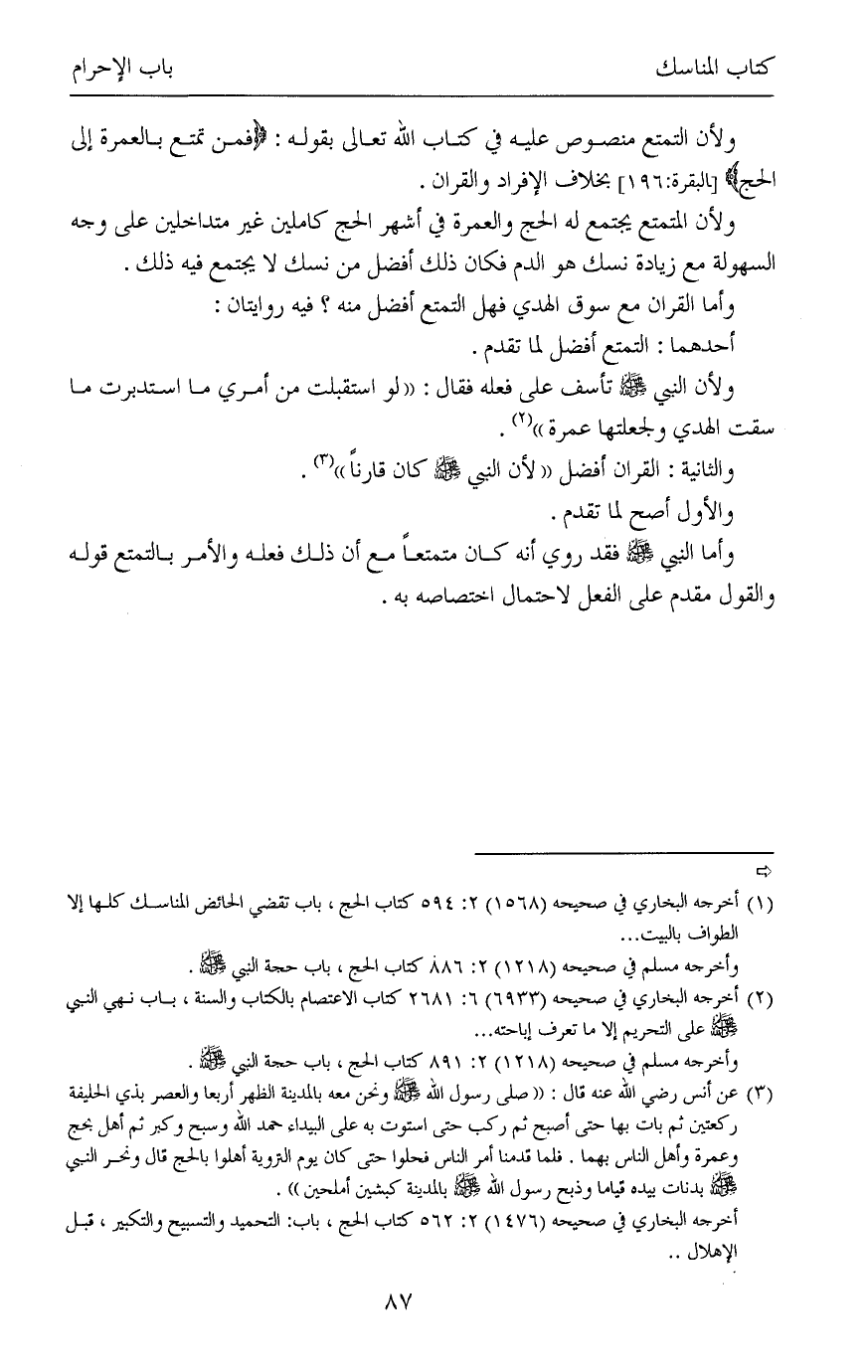 (¬2) عن أنس رضي الله عنه قال: «صلى رسول الله صلى الله عليه وسلم ونحن معه بالمدينة الظهر أربعا والعصر بذي الحليفة ركعتين ثم بات بها حتى أصبح ثم ركب حتى استوت به على البيداء حمد الله وسبح وكبر ثم أهل بحج وعمرة وأهل الناس بهما. فلما قدمنا أمر الناس فحلوا حتى كان يوم التروية أهلوا بالحج قال ونحر النبي صلى الله عليه وسلم بدنات بيده قياما وذبح رسول الله صلى الله عليه وسلم بالمدينة كبشين أملحين».