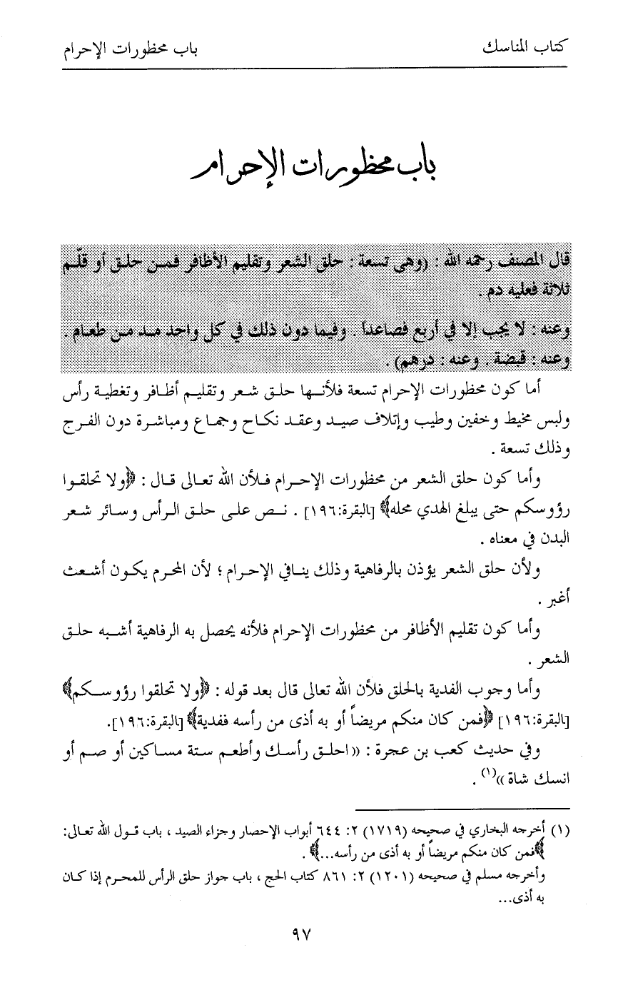 أما كون محظورات الإحرام تسعة فلأنها حلق شعر وتقليم أظافر وتغطية رأس ولبس مخيط وخفين وطيب وإتلاف صيد وعقد نكاح وجماع ومباشرة دون الفرج وذلك تسعة.