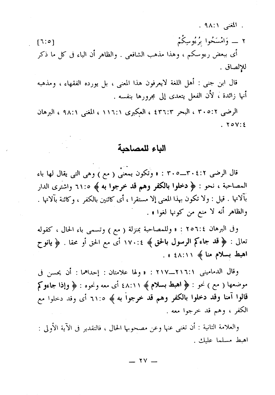 وفي البرهان 4: 256: «وللمصاحبة بمنزلة (مع) وتسمى باء الحال، كقوله تعالى: {قد جاءكم الرسول بالحق} 4: 170 أي مع الحق أو محقًا. {يا نوح اهبط بسلام منا} 11: 48».