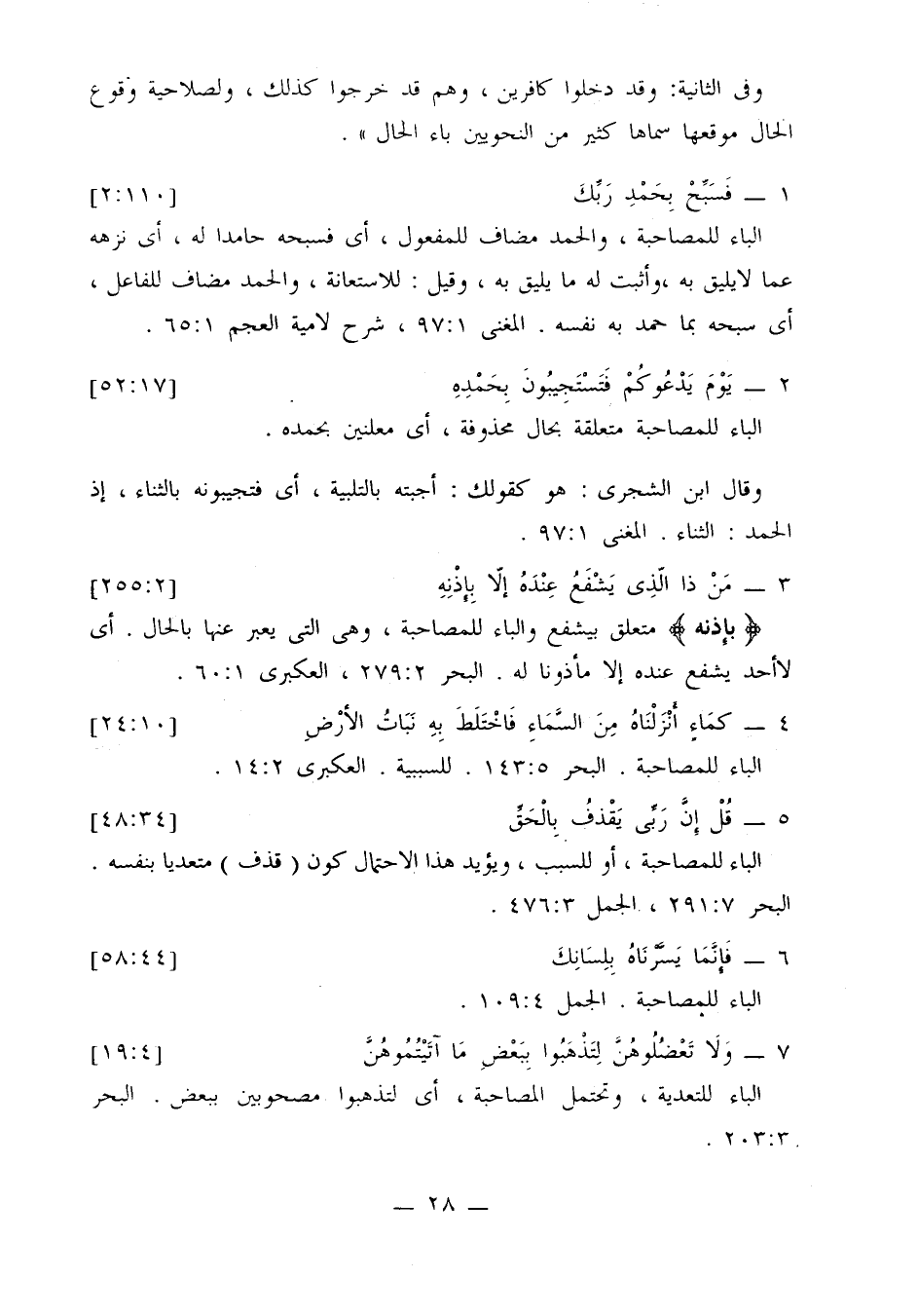 وفي الثانية: وقد دخلوا كافرين، وهم قد خرجوا كذلك، ولصلاحية وقوع الحال موقعها سماها كثير من النحويين باء الحال».