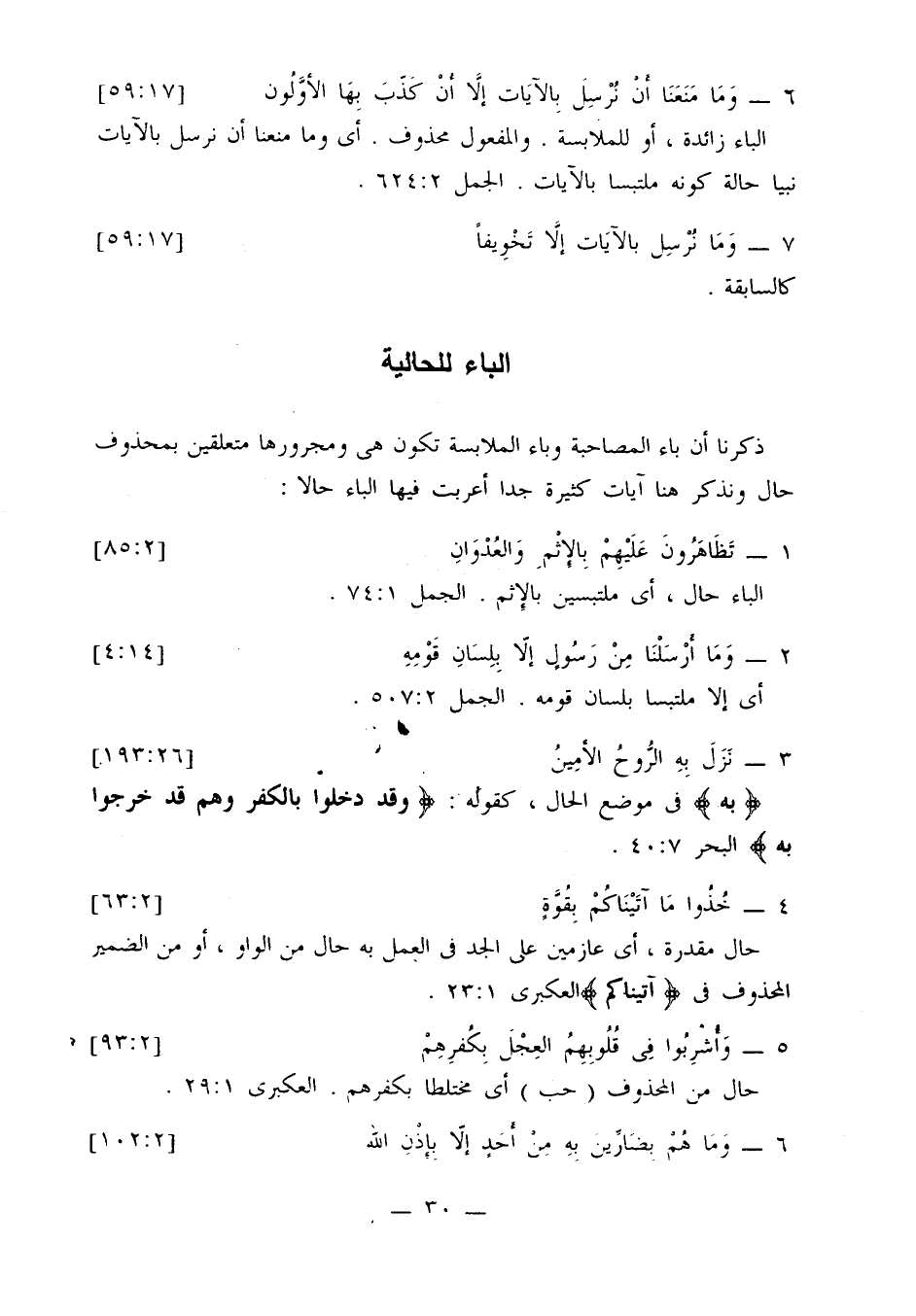 ذكرنا أن باء المصاحبة وباء الملابسة تكون هي ومجرورها متعلقين بمحذوف حال ونذكر هنا آيات كثيرة جدًا أعربت فيها الباء حالاً: