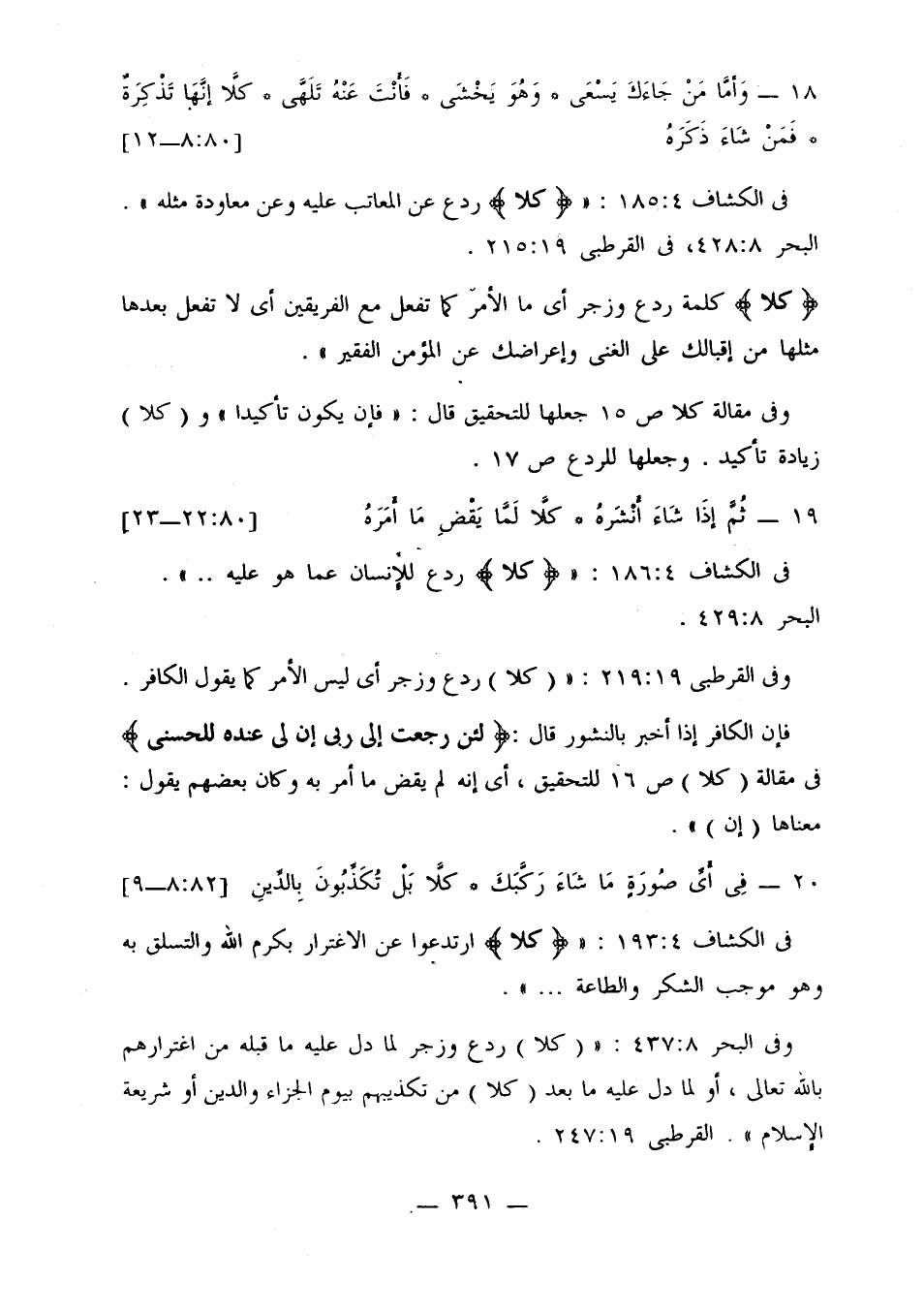 في الكشاف 4: 185: «{كلا} ردع عن المعاتب عليه وعن معاودة مثله». البحر 8: 428، في القرطبي 19: 215.