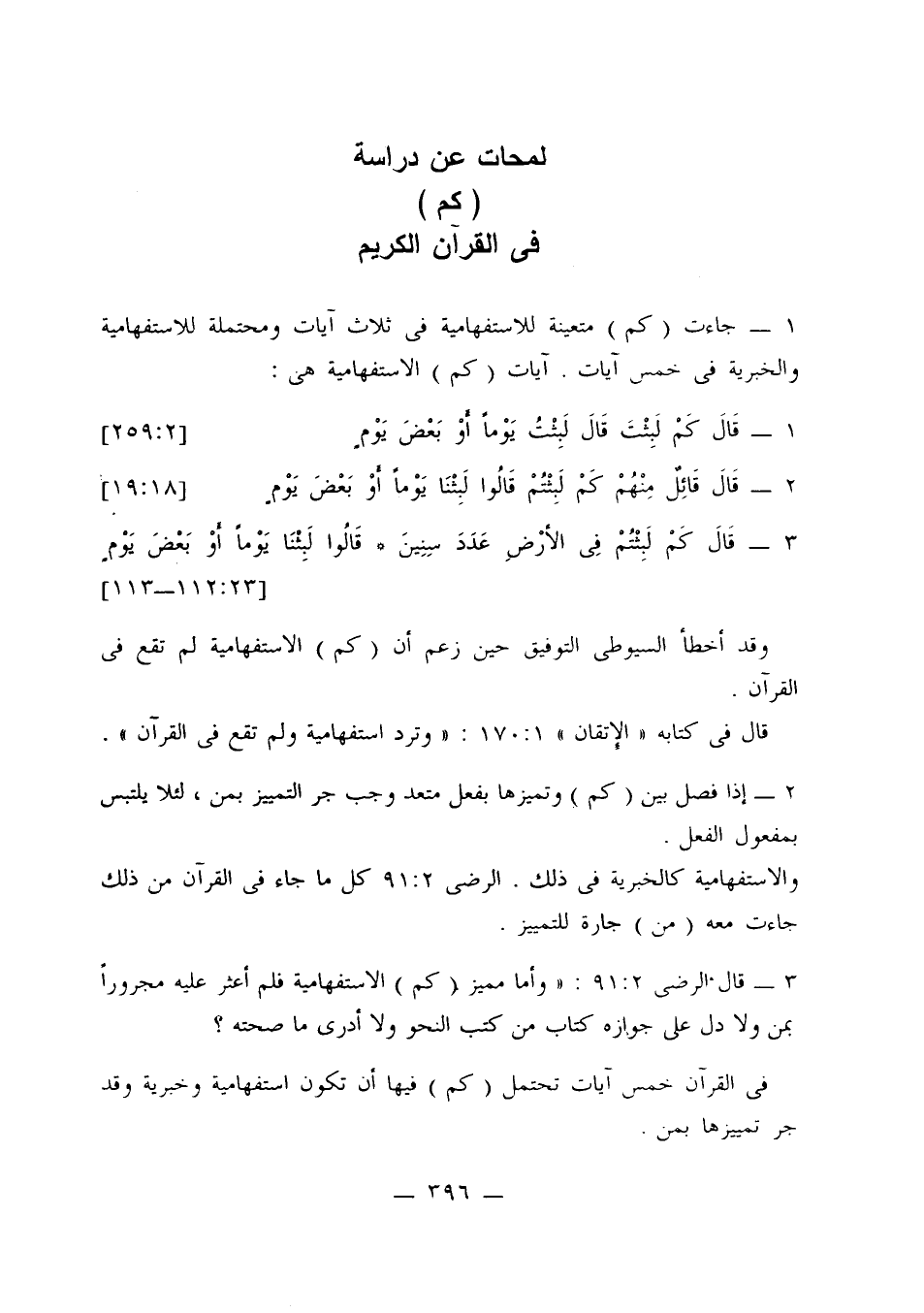 3 - قال الرضى 2: 91: «وأما مميز (كم) الاستفهامية فلم أعثر عليه مجرورًا بمن ولا دل على جوازه كتاب من كتب النحو ولا أدري ما صحته؟