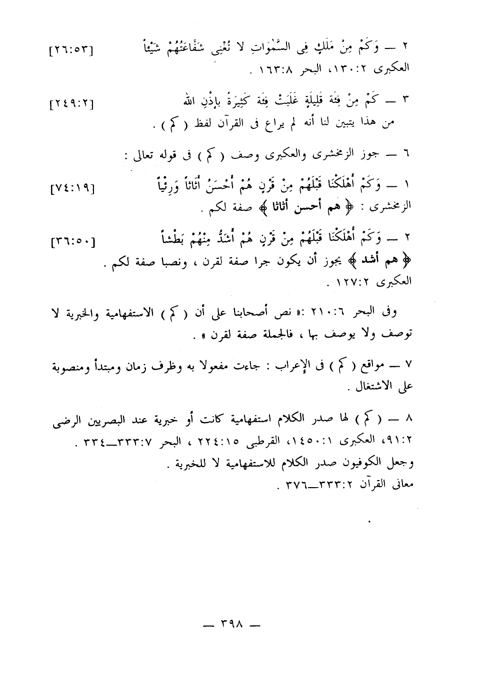 8 - (كم) لها صدر الكلام استفهامية كانت أو خبرية عند البصريين الرضى 2: 91، العكبري 1: 1450، القرطبي 15: 224، البحر 7: 33 - 334. وجعل الكوفيون صدر الكلام للاستفهامية لا للخبرية. معاني القرآن 2: 333 - 376.
