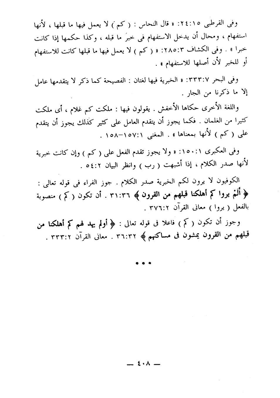 وفي القرطبي 15: 24: «قال النحاس: (كم) لا يعمل فيها ما قبلها، لأنها استفهام، ومحال أن يدخل الاستفهام في خبر ما قبله، وكذا حكمها إذا كانت خبرًا». وفي الكشاف 3: 285: «(كم) لا يعمل فيها ما قبلها كانت للاستفهام أو للخبر لأن أصلها للاستفهام».