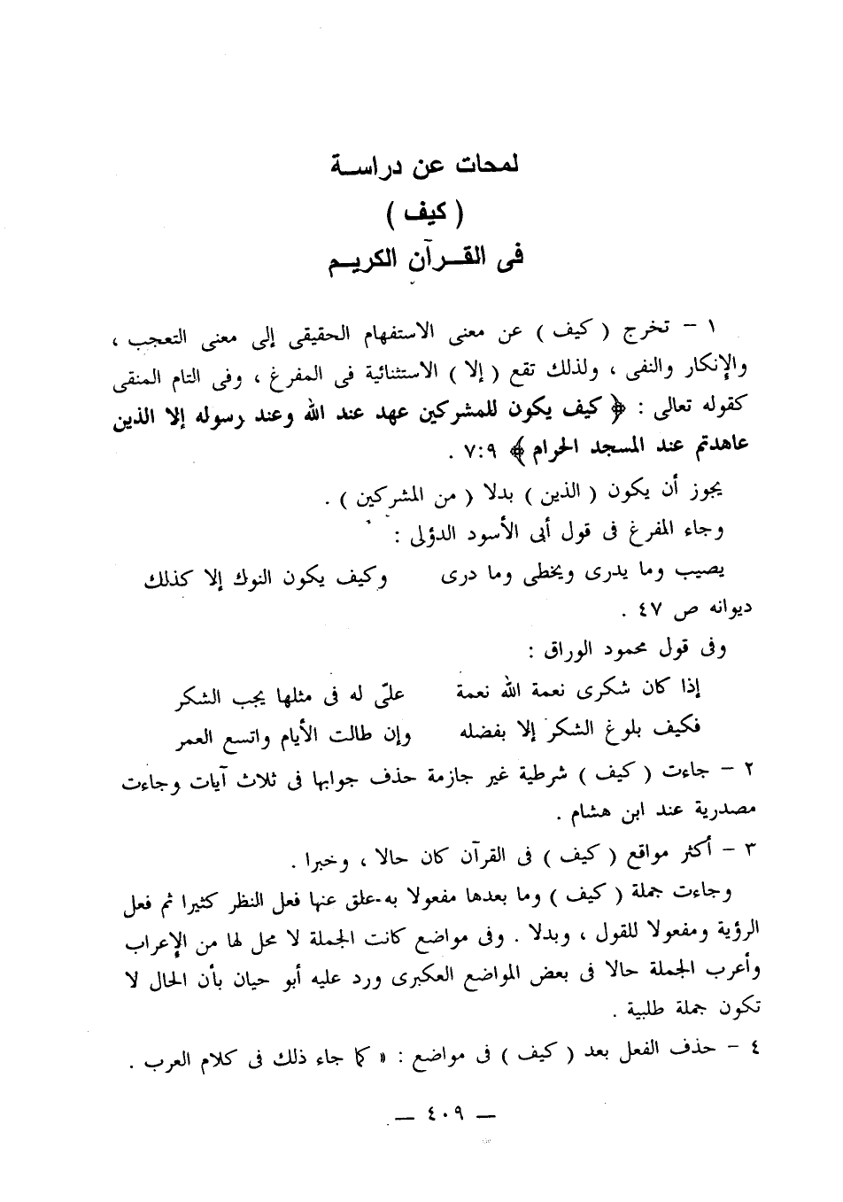 1 - تخرج (كيف) عن معنى الاستفهام الحقيقي إلى معنى التعجب، والإنكار والنفي، ولذلك تقع (إلا) الاستثنائية في المفرغ، وفي التام المنقى كقوله تعالى: {كيف يكون للمشركين عهد عند الله وعند رسوله إلا الذين عاهدتم عند المسجد الحرام} 9: 7.