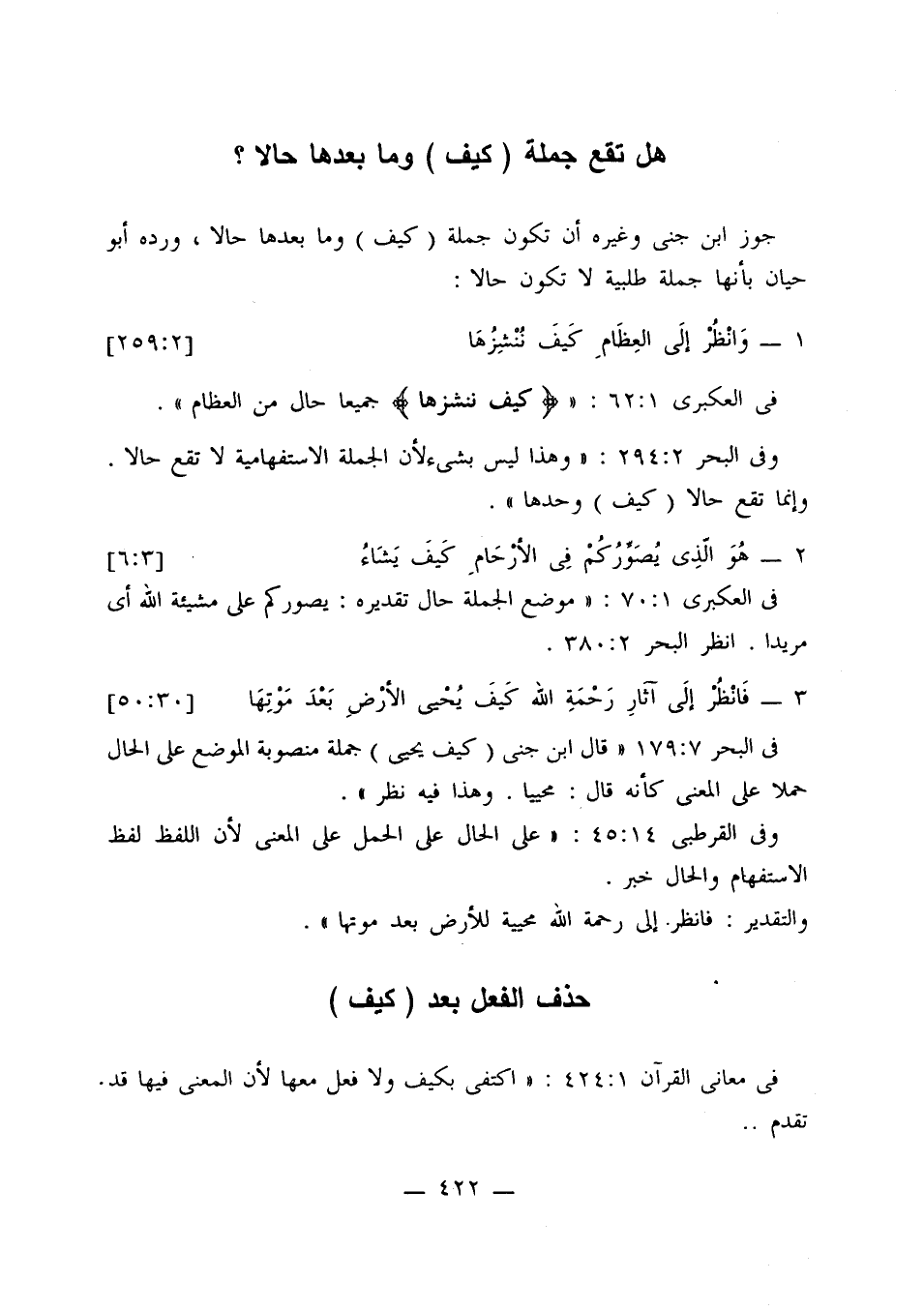 في البحر 7: 179: «قال ابن جنى (كيف يحيي) جملة منصوبة الموضع على الحال حملا على المعنى كأنه قال: محييا. وهذا فيه نظر».