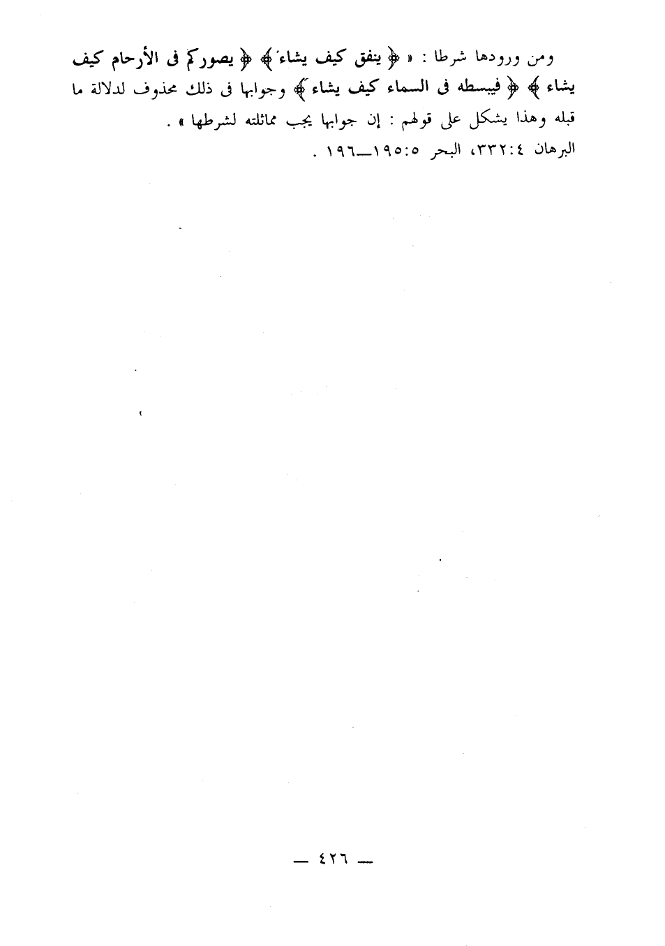 ومن ورودها شرطا: {ينفق كيف يشاء} {يصوركم في الأرحام كيف يشاء} {فيبسطه في السماء كيف يشاء} وجوابها في ذلك محذوف لدلالة ما قبله وهذا يشكل على قولهم: إن جوابها يجب مماثلته لشرطها. البرهان 4: 332، البحر 5: 195 - 196.