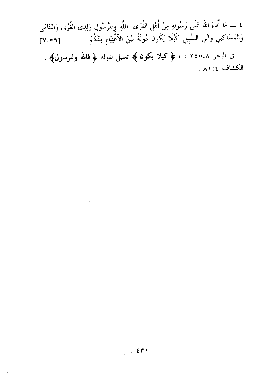 في البحر 8: 245: «{كيلا يكون} تعليل لقوله {فالله وللرسول}». الكشاف 4: 81.
