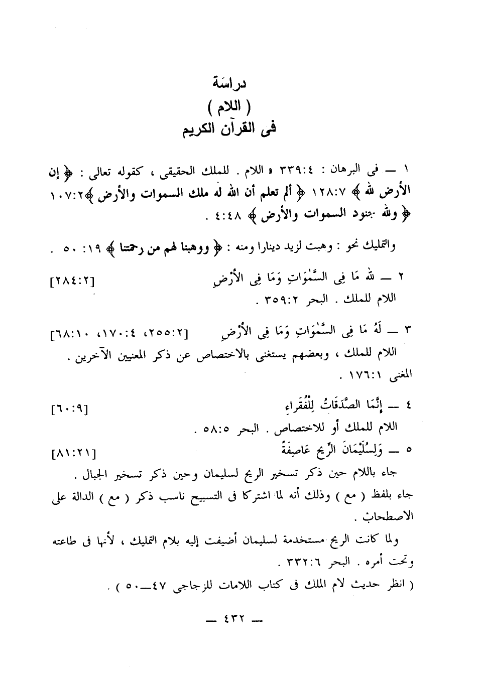 1 - في البرهان: 4: 339: «اللام. للملك الحقيقي، كقوله تعالى: {إن الأرض لله} 7: 128 {ألم تعلم أن الله له ملك السموات والأرض} 2: 107 {ولله جنود السموات والأرض} 48: 4.
