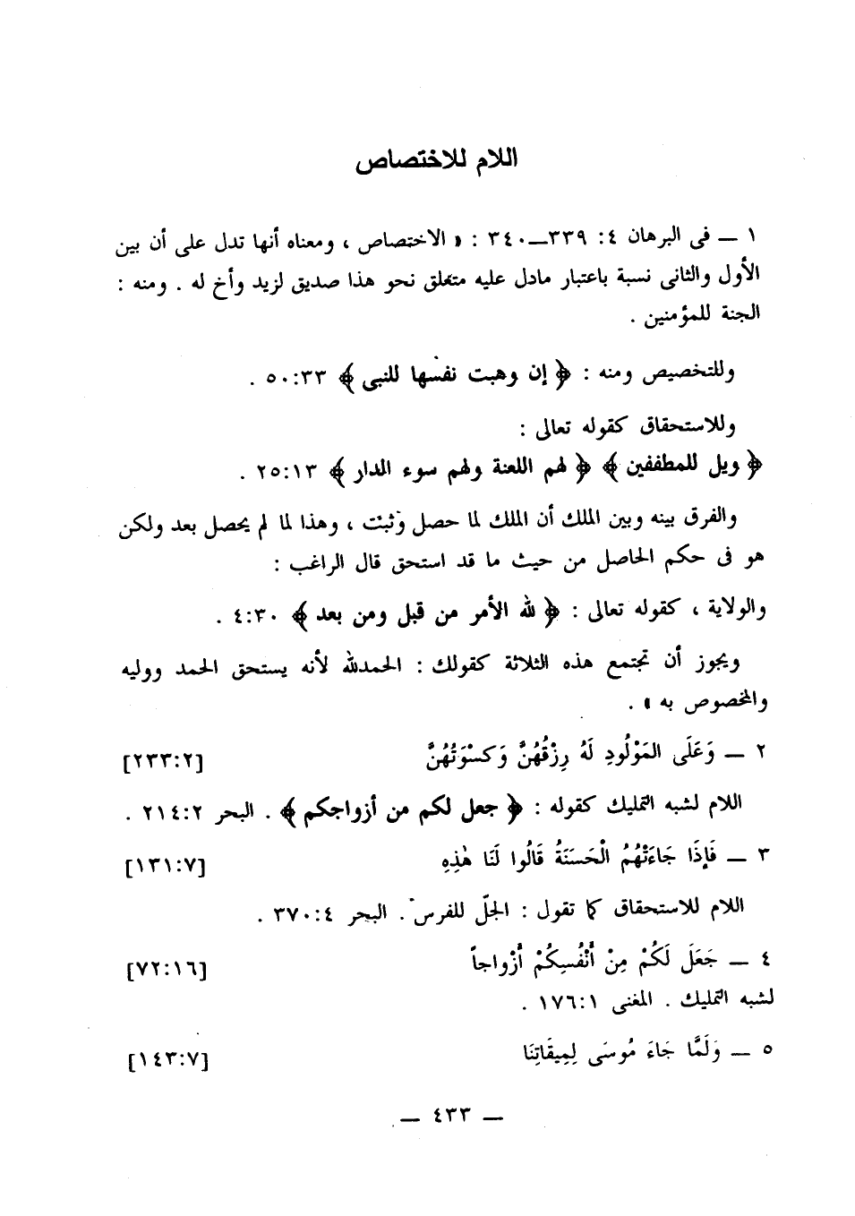 1 - في البرهان 4: 339 - 340: «الاختصاص، ومعناه أنها تدل على أن بين الأول والثاني نسبة باعتبار ما دل عليه متعلق نحو هذا صديق لزيد وأخ له. ومنه: الجنة للمؤمنين.