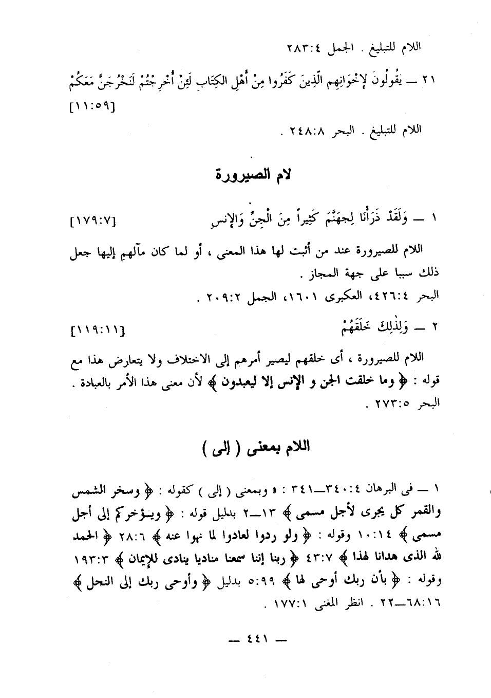 1 - في البرهان 4: 340 - 341: «وبمعنى (إلى) كقوله: {وسخر الشمس والقمر كل يجري لأجل مسمى} 13 - 2 بدليل قوله: {ويؤخركم إلى أجل مسمى} 14: 10، وقوله: {ولو ردوا لعادوا لما نهوا عنه} 6: 28 {الحمد لله الذي هدانا لهذا} 7: 43 {ربنا إننا سمعنا مناديا ينادي للإيمان} 3: 193 وقوله: {بأن ربك أوحى لها} 99: 5، بدليل {وأوحى ربك إلى النحل} 16: 68 - 22. انظر المغني 1: 177.