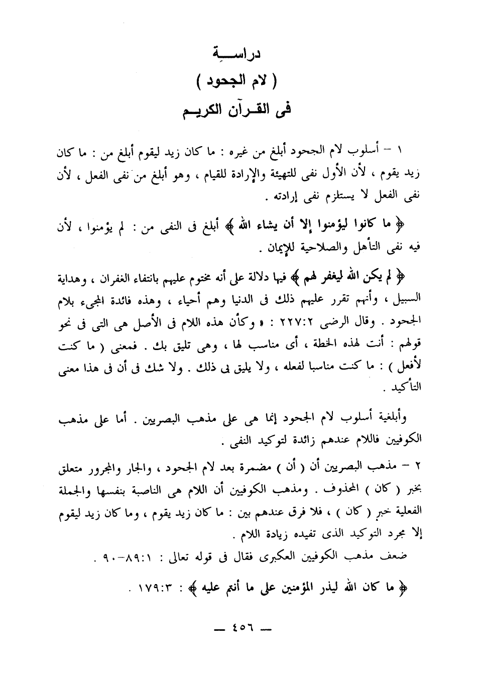 2 - مذهب البصريين أن (أن) مضمرة بعد لام الجحود، والجار والمجرور متعلق بخبر (كان) المحذوف. ومذهب الكوفيين أن اللام هي الناصبة بنفسها والجملة الفعلية خبر (كان)، فلا فرق عندهم بين: ما كان زيد يقوم، وما كان زيد ليقوم إلا مجرد التوكيد الذي تفيده زيادة اللام.