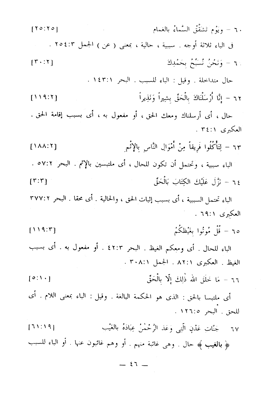 في الباء ثلاثة أوجه. سببية، حالية، بمعنى (عن) الجمل 3: 254.
