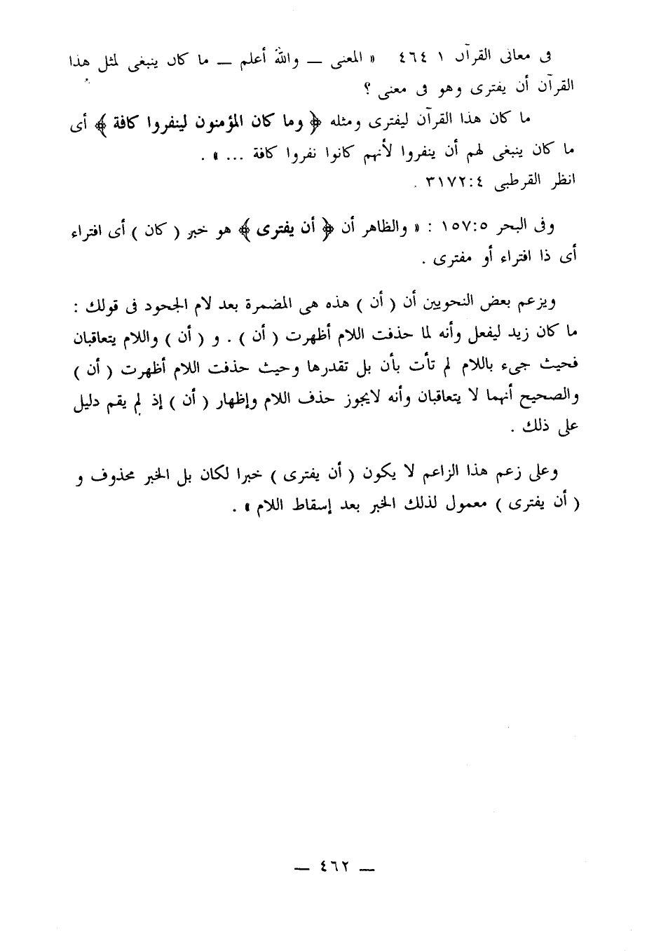 وعلى زعم هذا الزاعم لا يكون (أن يفترى) خبرًا لكان بل الخبر محذوف و (أن يفترى) معمول لذلك الخبر بعد إسقاط اللام».