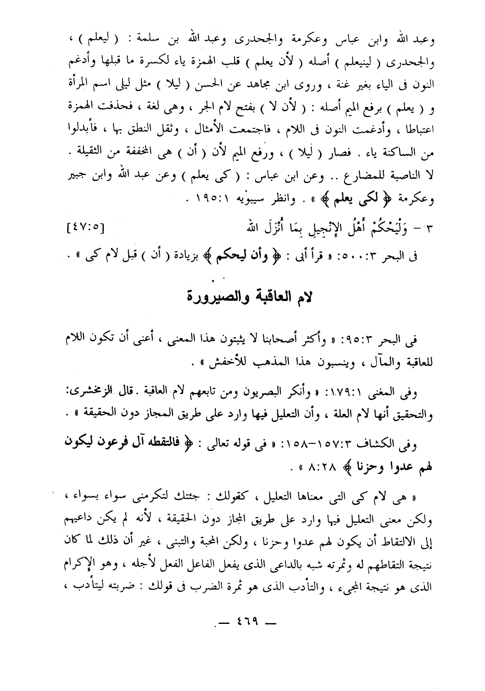 وفي المغني 1: 179: «وأنكر البصريون ومن تابعهم لام العاقبة. قال الزمخشري: والتحقيق أنها لام العلة، وأن التعليل فيها وارد على طريق المجاز دون الحقيقة».