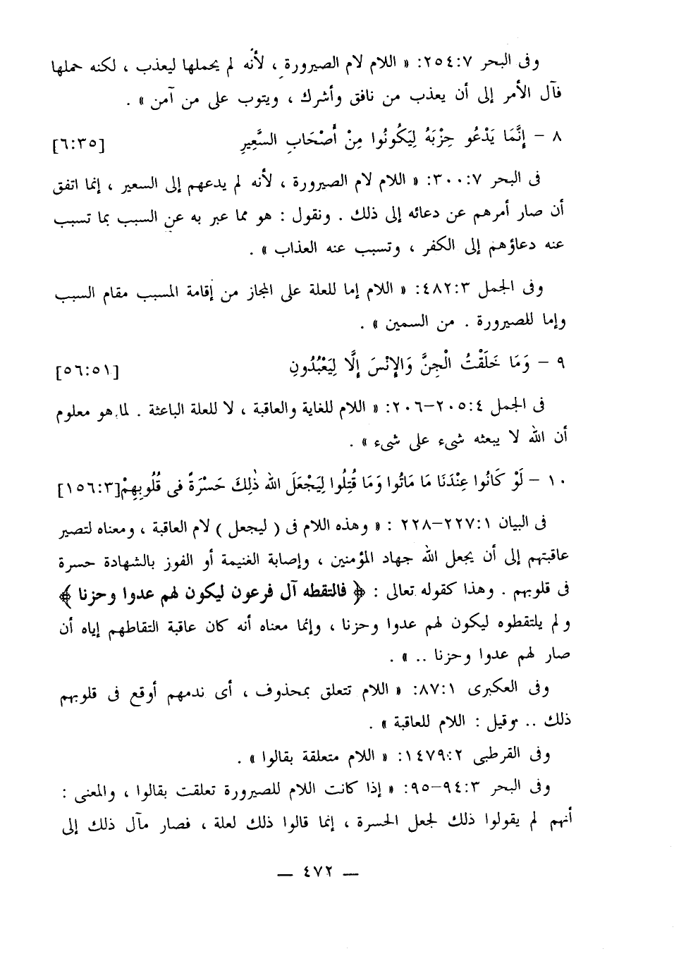 في الجمل 4: 205 - 206: «اللام للغاية والعاقبة، لا للعلة الباعثة. لما هو معلوم أن الله لا يبعثه شيء على شيء».