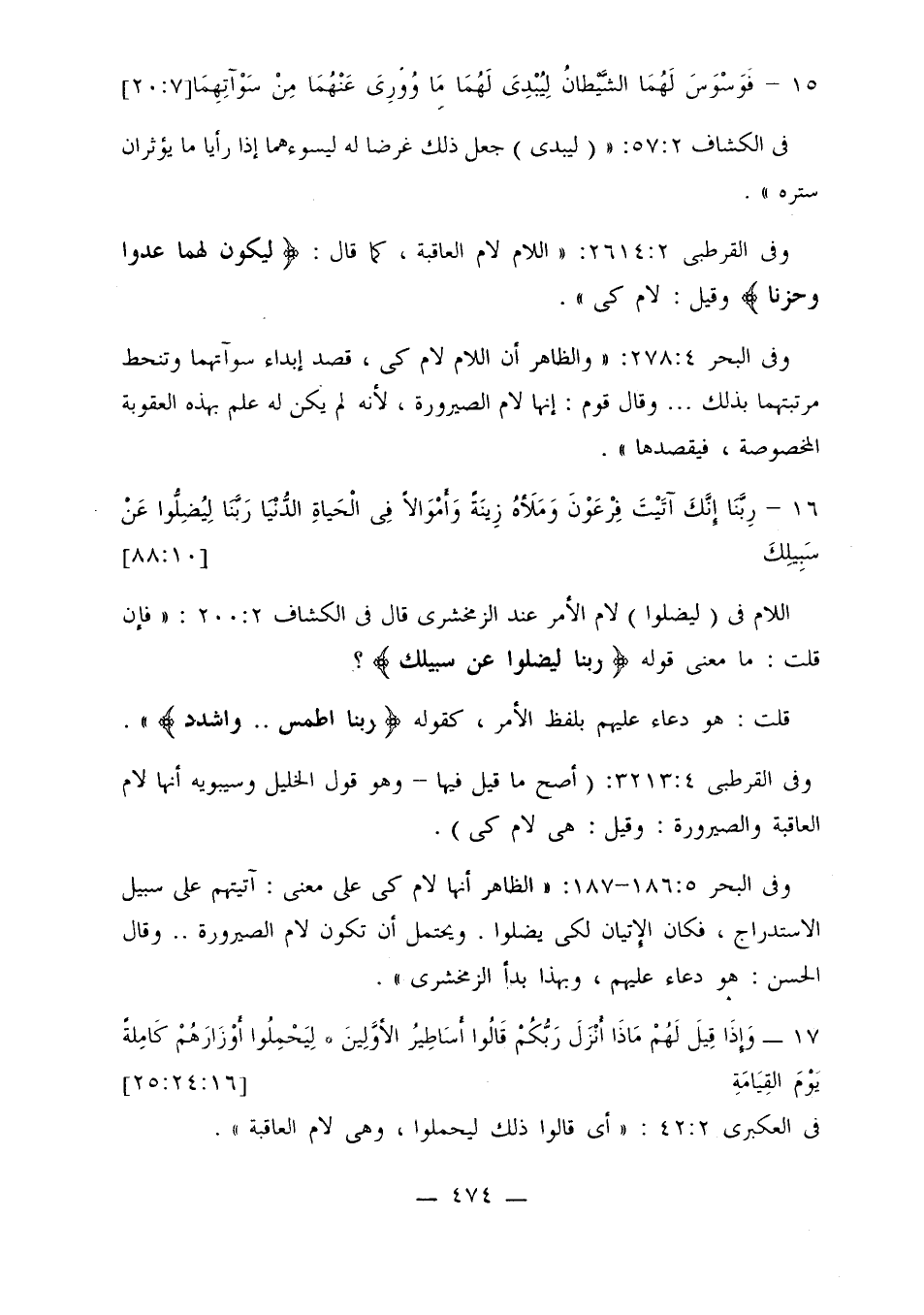 وفي البحر 5: 186 - 187: «الظاهر أنها لام كي على معنى: آتيتهم على سبيل الاستدراج، فكان الإتيان لكي يضلوا. ويحتمل أن تكون لام الصيرورة ... وقال الحسن: هو دعاء عليهم، وبهذا بدأ الزمخشري».