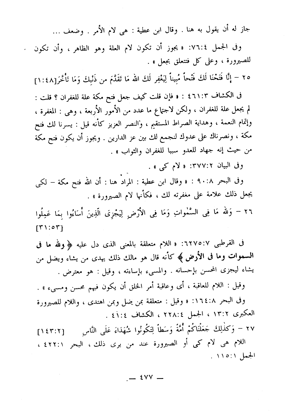 وفي البحر 8: 90: «وقال ابن عطية: المراد هنا: أن الله فتح مكة - لكي يجعل ذلك علامة على مغفرته لك، فكأنها لام الصيرورة».