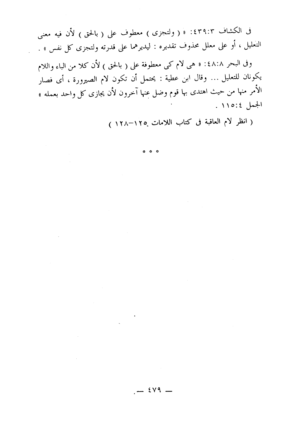 في الكشاف 3: 439: «(ولتجزي) معطوف على (بالحق) لأن فيه معنى التعليل، أو على معلل محذوف تقديره: ليديرهما على قدرته ولتجزي كل نفس».