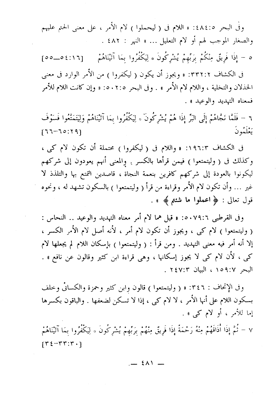 في الكشاف 3: 196: «واللام في (ليكفروا) محتملة أن تكون لام كي، وكذلك في (وليتمتعوا) فيمن قرأها بالكسر. والمعنى أنهم يعودون إلى شركهم ليكونوا بالعودة إلى شركهم كافرين بنعمة النجاة، قاصدين التمتع بها والتلذذ لا غير ... وأن تكون لام الأمر وقراءة من قرأ (وليتمتعوا) بالسكون تشهد له، ونحوه قوله تعالى: {اعملوا ما شئتم}».