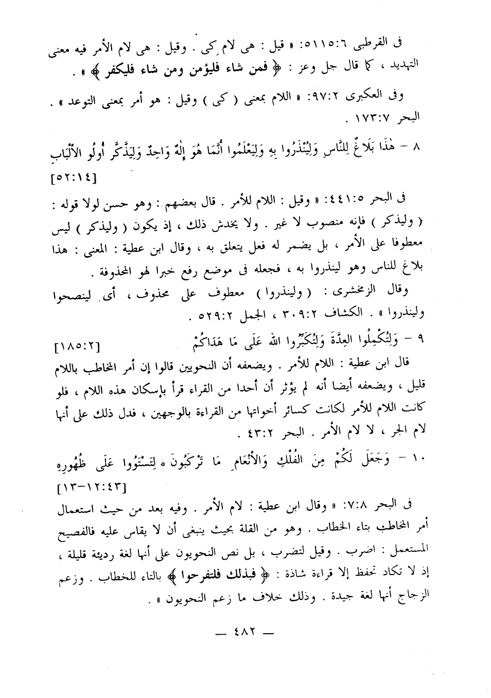 في البحر 5: 441: «وقيل: اللام للأمر. قال بعضهم: وهو حسن لولا قوله: (وليذكر) فإنه منصوب لا غير. ولا يخدش ذلك، إذ يكون (وليذكر) ليس معطوفًا على الأمر، بل يضمر له فعل يتعلق به، وقال ابن عطية: المعنى: هذا بلاغ للناس وهو لينذروا به، فجعله في موضع رفع خبرا لهو المحذوفة.