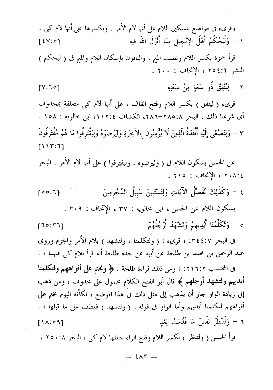في البحر 7: 344: «قرئ: (ولتكلمنا، ولتشهد) بلام الأمر والجزم وروى عبد الرحمن بن محمد بن طلحة عن أبيه عن جده طلحة أنه قرأ بلام كي فيهما».