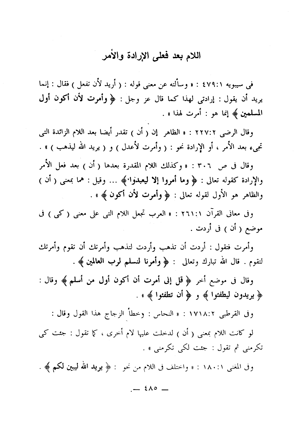 في سيبويه 1: 479: «وسألته عن معنى قوله (أريد لأن تفعل) فقال: إنما يريد أن يقول: إرادتي لهذا كما قال عز وجل {وأمرت لأن أكون أول المسلمين} إنما هو: أمرت لهذا».