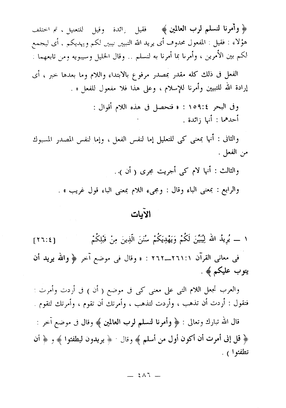قال الله تبارك وتعالى: {وأمرنا لنسلم لرب العالمين} وقال في موضع آخر: {قل إني أمرت أن أكون أول من أسلم} وقال: {يريدون ليطفئوا} و {أن تطفئوا}.