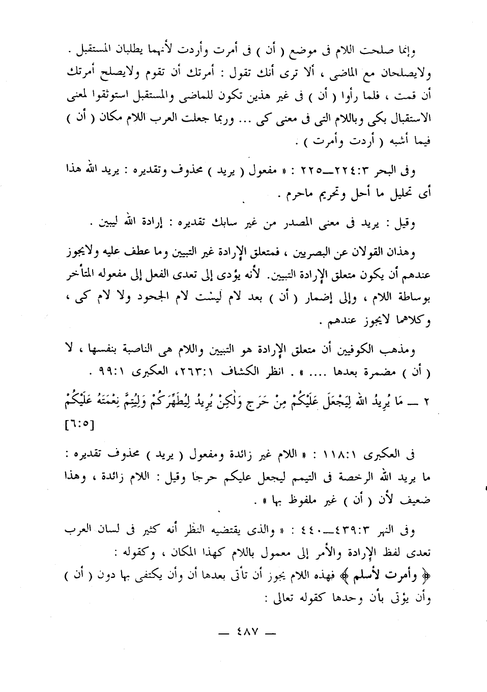 وفي النهر 3: 439 - 440: «والذي يقتضيه النظر أنه كثير في لسان العرب تعدي لفظ الإرادة والأمر إلى معمول باللام كهذا المكان، وكقوله: