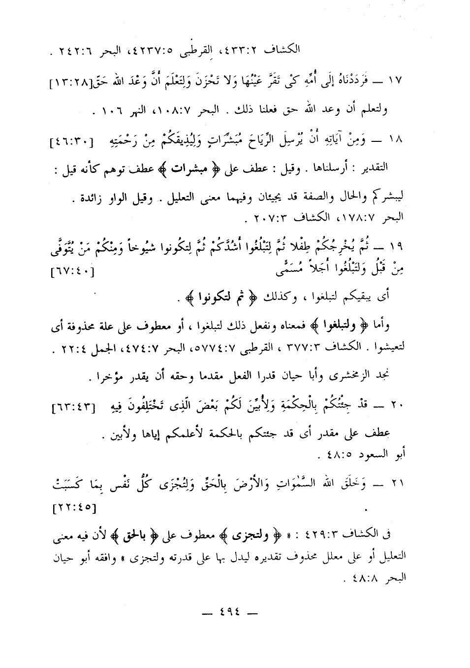 في الكشاف 3: 429: «{ولتجزي} معطوف على {بالحق} لأن فيه معنى التعليل أو على معلل محذوف تقديره ليدل بها على قدرته ولتجزي» وافقه أبو حيان البحر 8: 48.