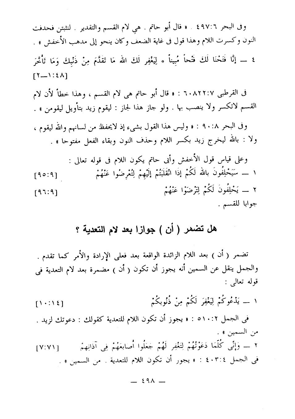 وفي البحر 8: 90: «وليس هذا القول بشيء إذ لا يحفظ من لسانهم والله ليقوم، ولا: بالله ليخرج زيد بكسر اللام وحذف النون وبقاء الفعل مفتوحًا».