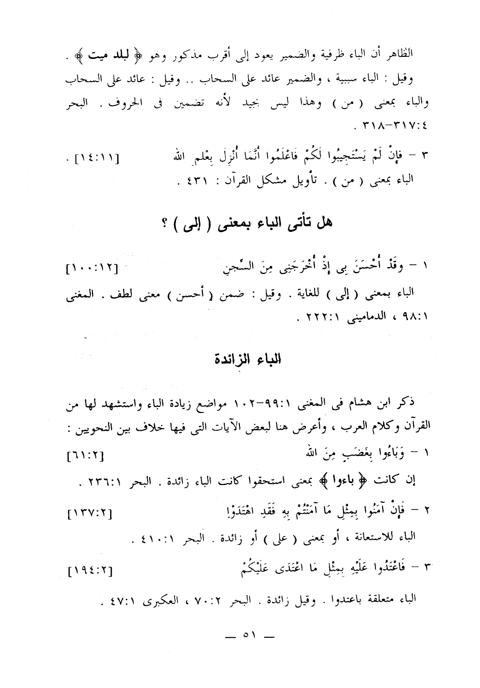 ذكر ابن هشام في المغني 1: 99 - 102 مواضع زيادة الباء واستشهد لها من القرآن وكلام العرب، وأعرض هنا لبعض الآيات التي فيها خلاف بين النحويين: