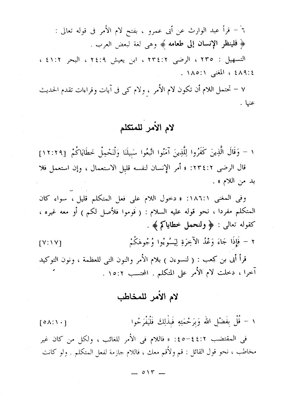 وفي المغني 1: 186: «دخول اللام على فعل المتكلم قليل، سواء كان المتكلم مفردًا، نحو قوله عليه السلام: (قوموا فلأصل لكم) أو معه غيره، كقوله تعالى: {ولنحمل خطاياكم}».