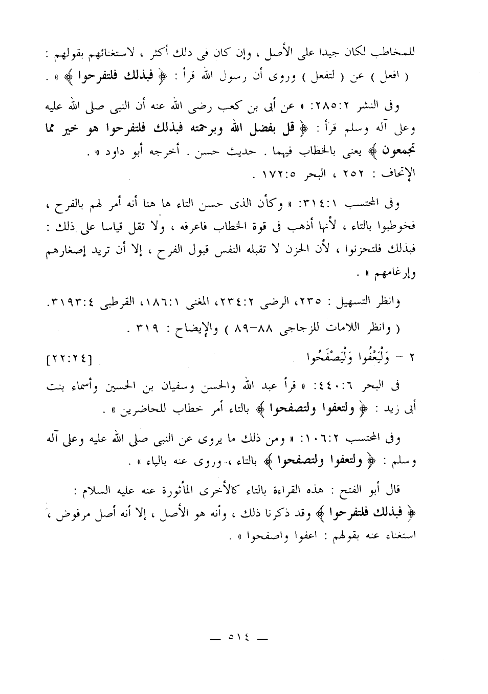 وفي المحتسب 2: 106: «ومن ذلك ما يروى عن النبي صلى الله عليه وعلى آله وسلم: {ولتعفوا ولتصفحوا} بالتاء، وروى عنه بالياء».