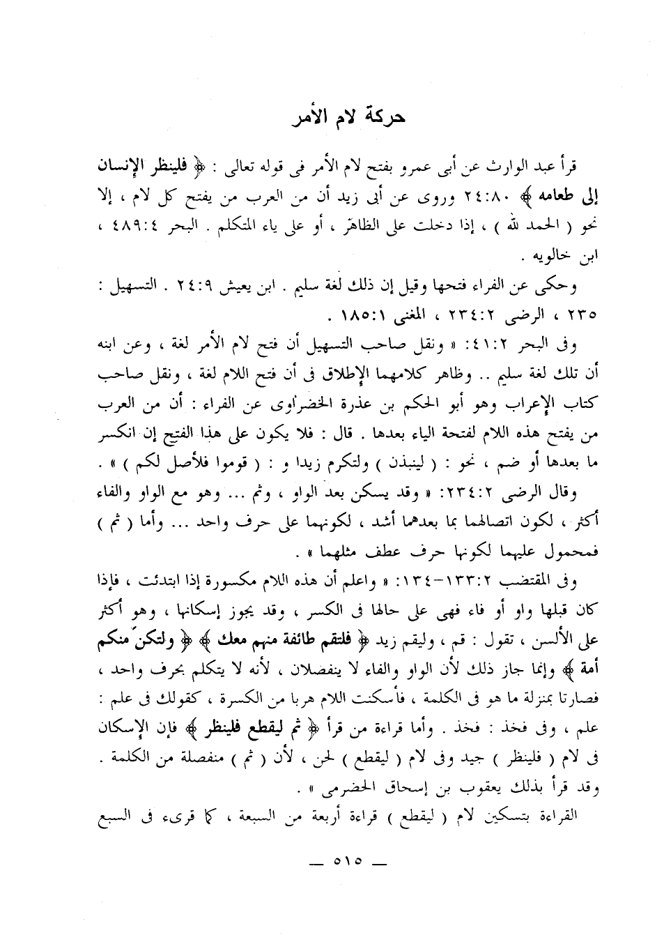 وفي المقتضب 2: 133 - 134: «واعلم أن هذه اللام مكسورة إذا ابتدئت، فإذا كان قبلها واو أو فاء فهي على حالها في الكسر، وقد يجوز إسكانها، وهو أكثر على الألسن، تقول: قم، وليقم زيد {فلتقم طائفة منهم معك} {ولتكن منكم أمة} وإنما جاز ذلك لأن الواو والفاء لا ينفصلان، لأنه لا يتكلم بحرف واحد، فصارتا بمنزلة ما هو في الكلمة، فأسكنت اللام هربا من الكسرة، كقولك في علم: علم، وفي فخذ: فخذ. وأما قراءة من قرأ {ثم ليقطع فلينظر} فإن الإسكان في لام (فلينظر) جيد وفي لام (ليقطع) لحن، لأن (ثم) منفصلة من الكلمة. وقد قرأ بذلك يعقوب بن إسحاق الحضرمي».