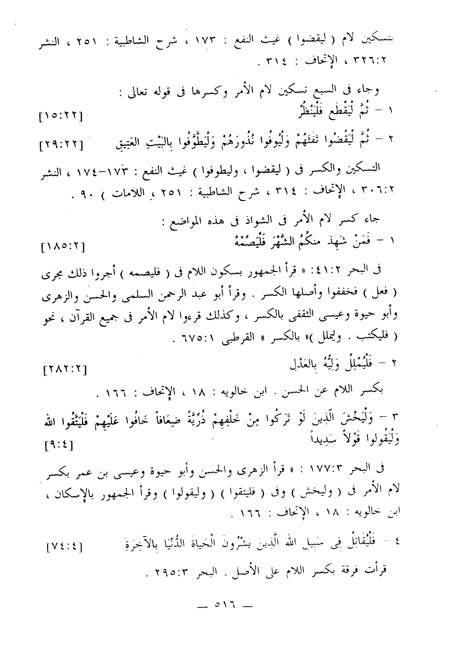 التسكين والكسر في (ليقضوا، وليطوفوا) غيث النفع: 173 - 174، النشر 2: 306، الإتحاف: 314، شرح الشاطبية: 251، اللامات 90.