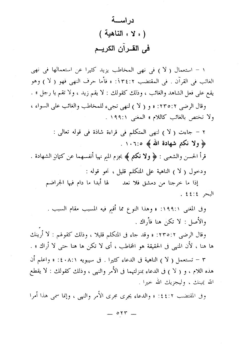 1 - استعمال (لا) في نهي المخاطب يزيد كثيرا عن استعمالها في نهي الغائب في القرآن. في المقتضب 2: 134: «فأما حرف النهي فهو (لا) وهو يقع على فعل الشاهد والغائب، وذلك كقولك: لا يقم زيد، ولا تقم يا رجل».