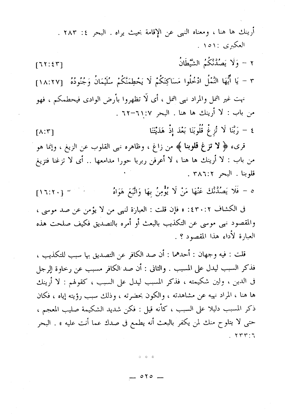 في الكشاف 2: 430: «فإن قلت: العبارة لنهي من لا يؤمن عند صد موسى، والمقصود نهي موسى عن التكذيب بالبعث أو أمره التصديق فكيف صلحت هذه العبارة لأداء هذا المقصود؟