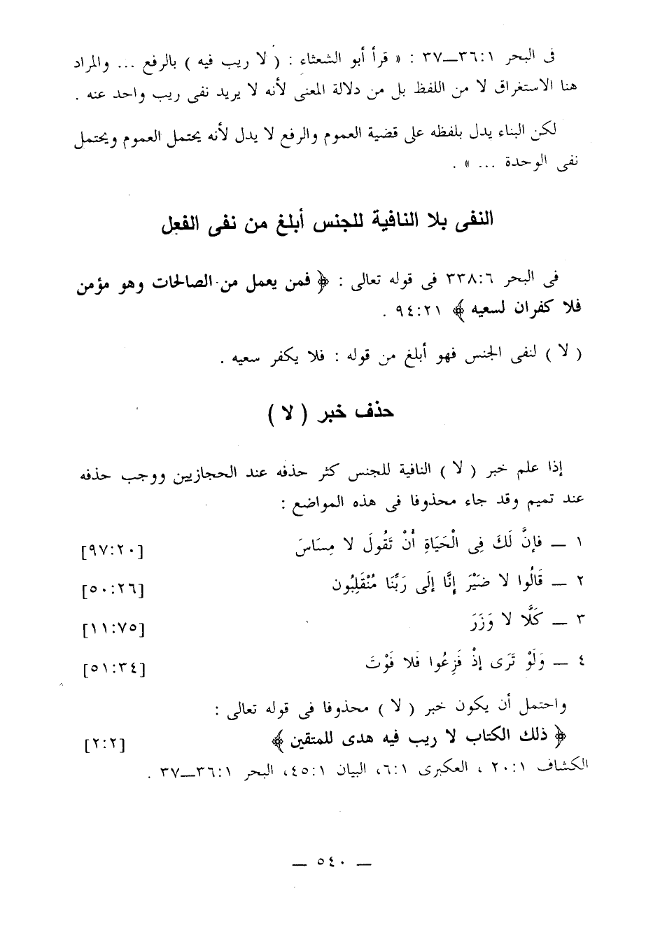 في البحر 1: 36 - 37: «قرأ أبو الشعثاء: (لا ريب فيه) بالرفع ... والمراد هنا الاستغراق لا من اللفظ بل من دلالة المعنى لأنه لا يريد نفي ريب واحد عنه.