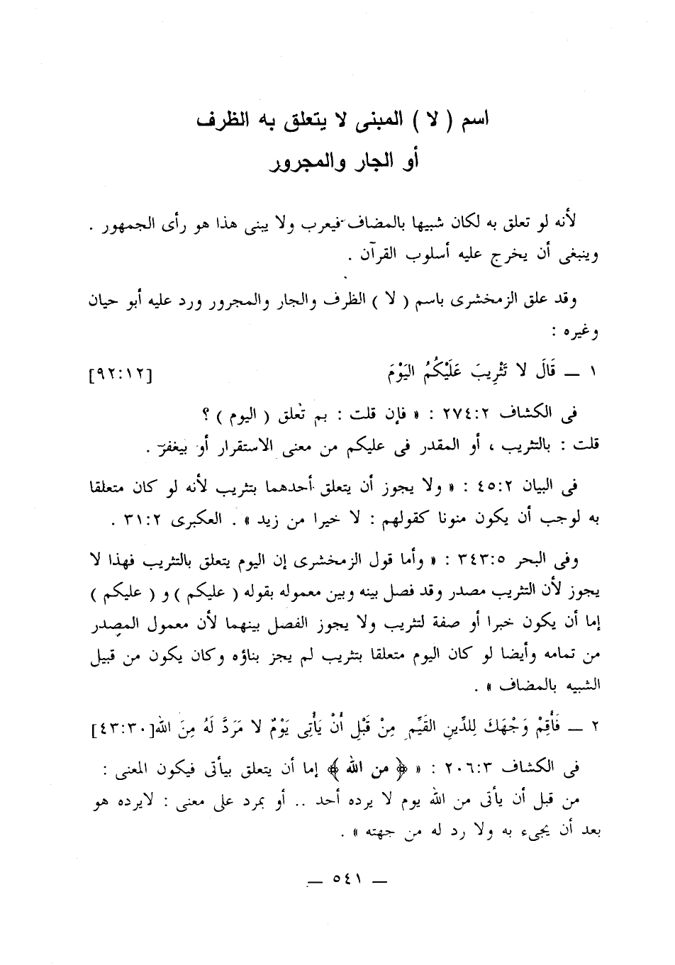 وقد علق الزمخشري باسم (لا) الظرف والجار والمجرور ورد عليه أبو حيان وغيره: