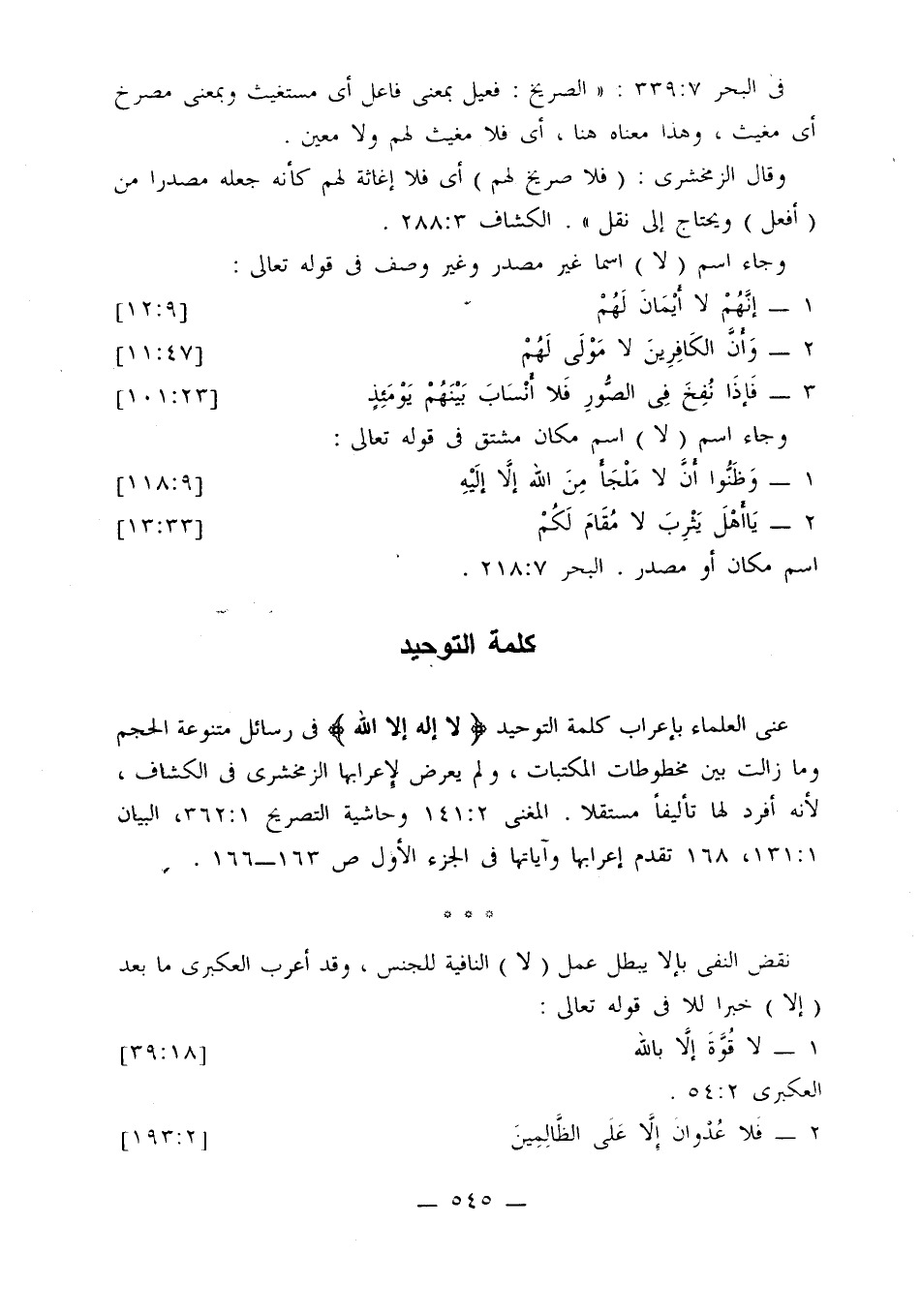 عنى العلماء بإعراب كلمة التوحيد {لا إله إلا الله} في رسائل متنوعة الحجم وما زالت بين مخطوطات المكتبات، ولم يعرض لإعرابها الزمخشري في الكشاف، لأنه أفرد لها تأليفًا مستقلاً. المغني 2: 141، وحاشية التصريح 1: 362، البيان 1: 131، 168، تقدم إعرابها وآياتها في الجزء الأول ص 163 - 166.