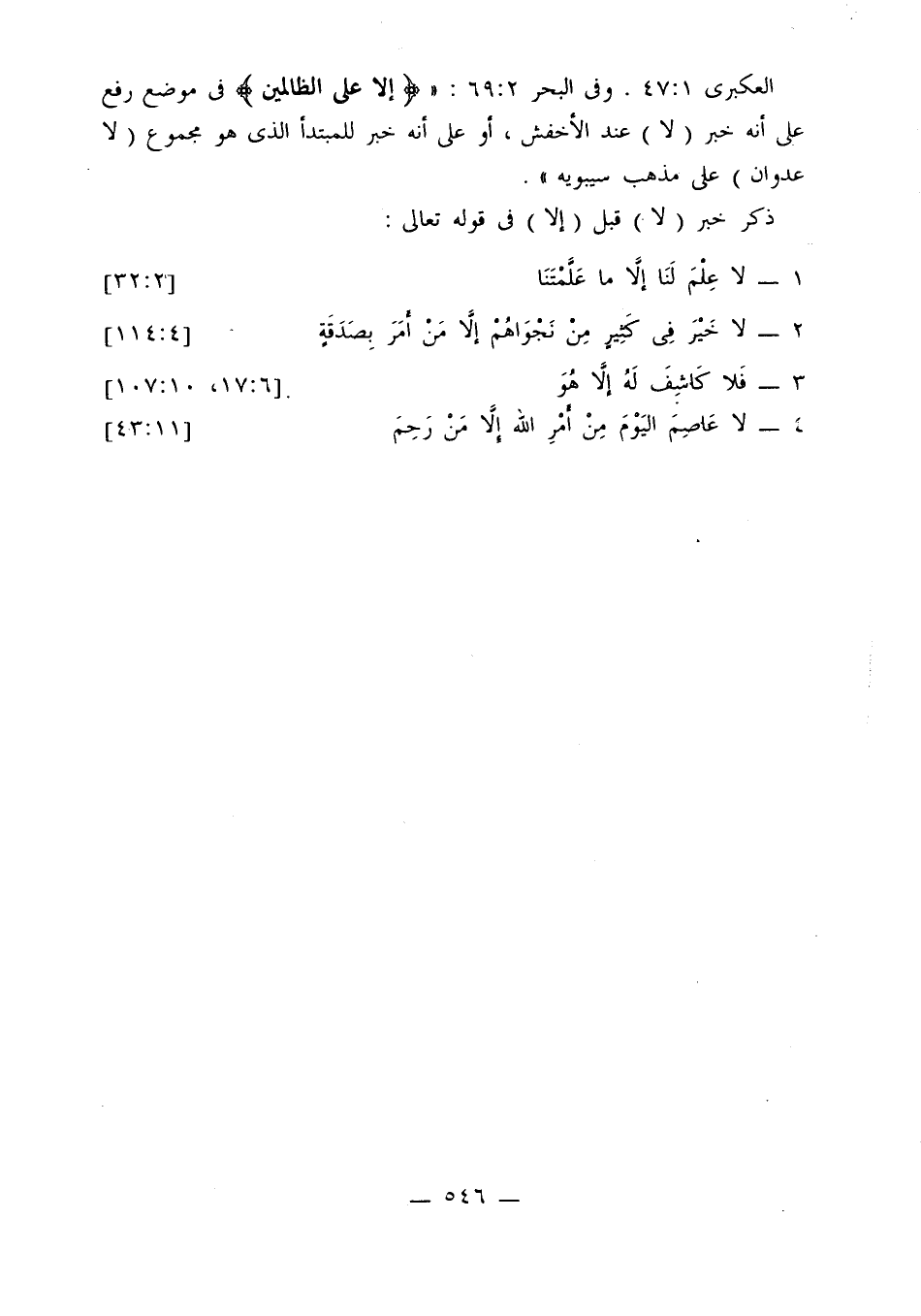 العكبري 1: 47، وفي البحر 2: 69: «{إلا على الظالمين} في موضع رفع على أنه خبر (لا) عند الأخفش، أو على أنه خبر للمبتدأ الذي هو مجموع (لا عدوان) على مذهب سيبويه».