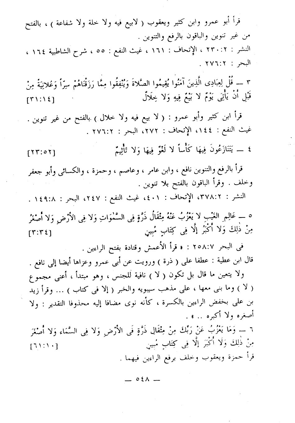 قرأ ابن كثير وأبو عمرو: (لا بيع فيه ولا خلال) بالفتح من غير تنوين. غيث النفع: 144، الإتحاف: 272، البحر 2: 276.