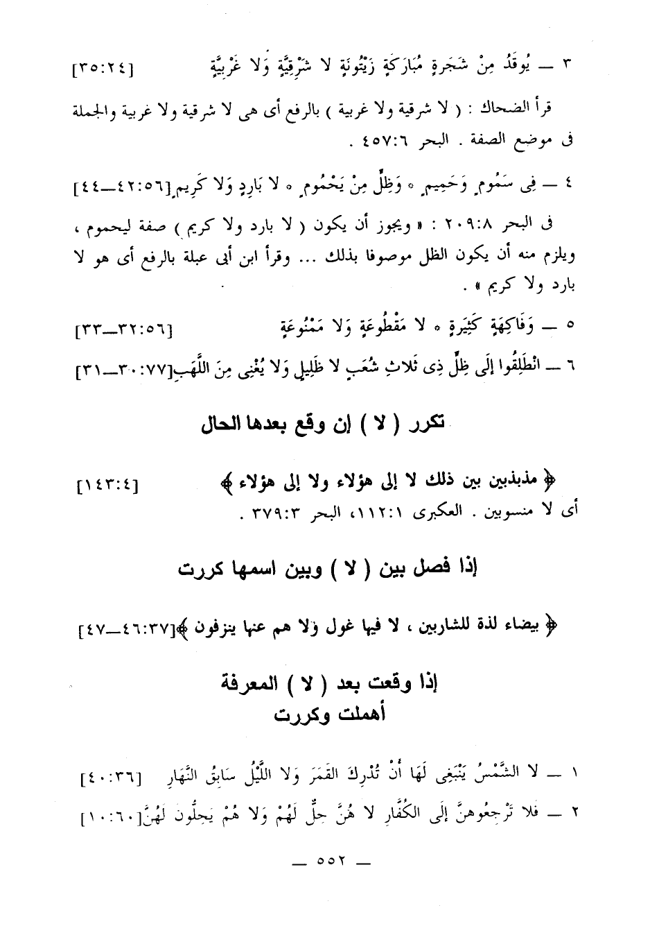 في البحر 8: 209: «ويجوز أن يكون (لا بارد ولا كريم) صفة ليحموم، ويلزم منه أن يكون الظل موصوفا بذلك ... وقرأ ابن أبي عبلة بالرفع أي هو لا بارد ولا كريم».