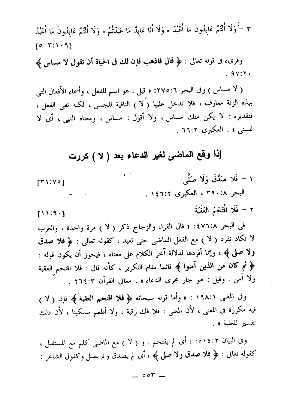 وفي المغني 1: 198: «وأما قوله سبحانه {فلا اقتحم العقبة} فإن (لا) فيه مكررة في المعنى، لأن المعنى: فلا فك رقبة، ولا أطعم مسكينا، لأن ذلك تفسير للعقبة».
